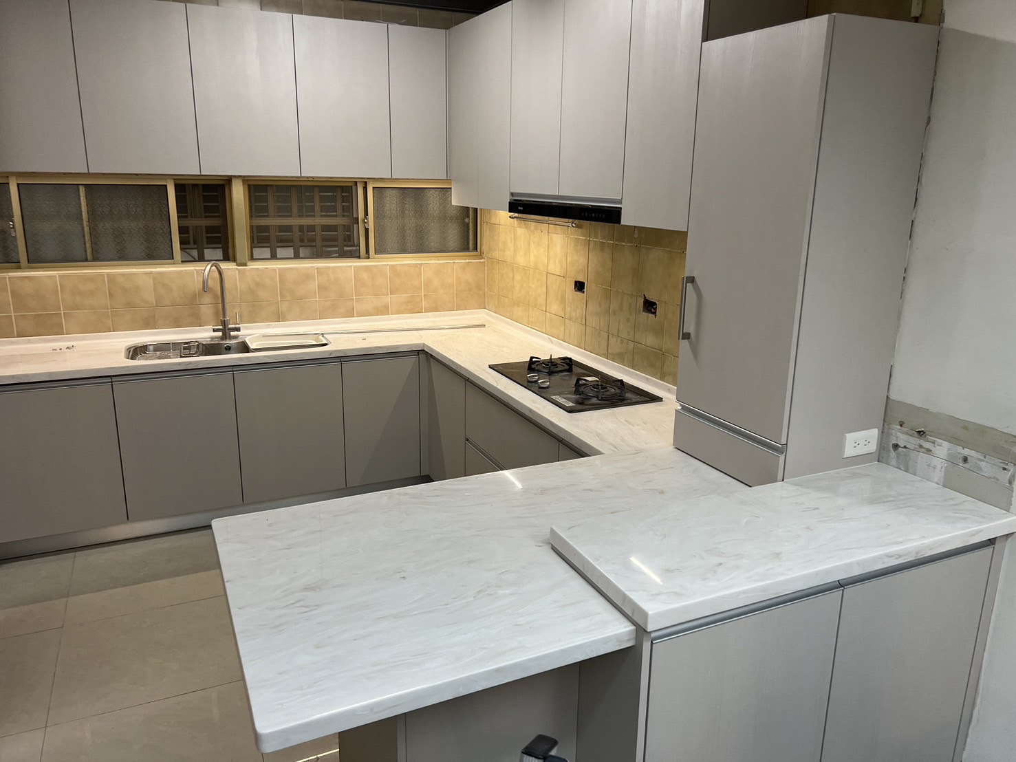 白底色營造出清新明亮的氛圍,檯面的紋理隨機且自然也增加了層次感。
