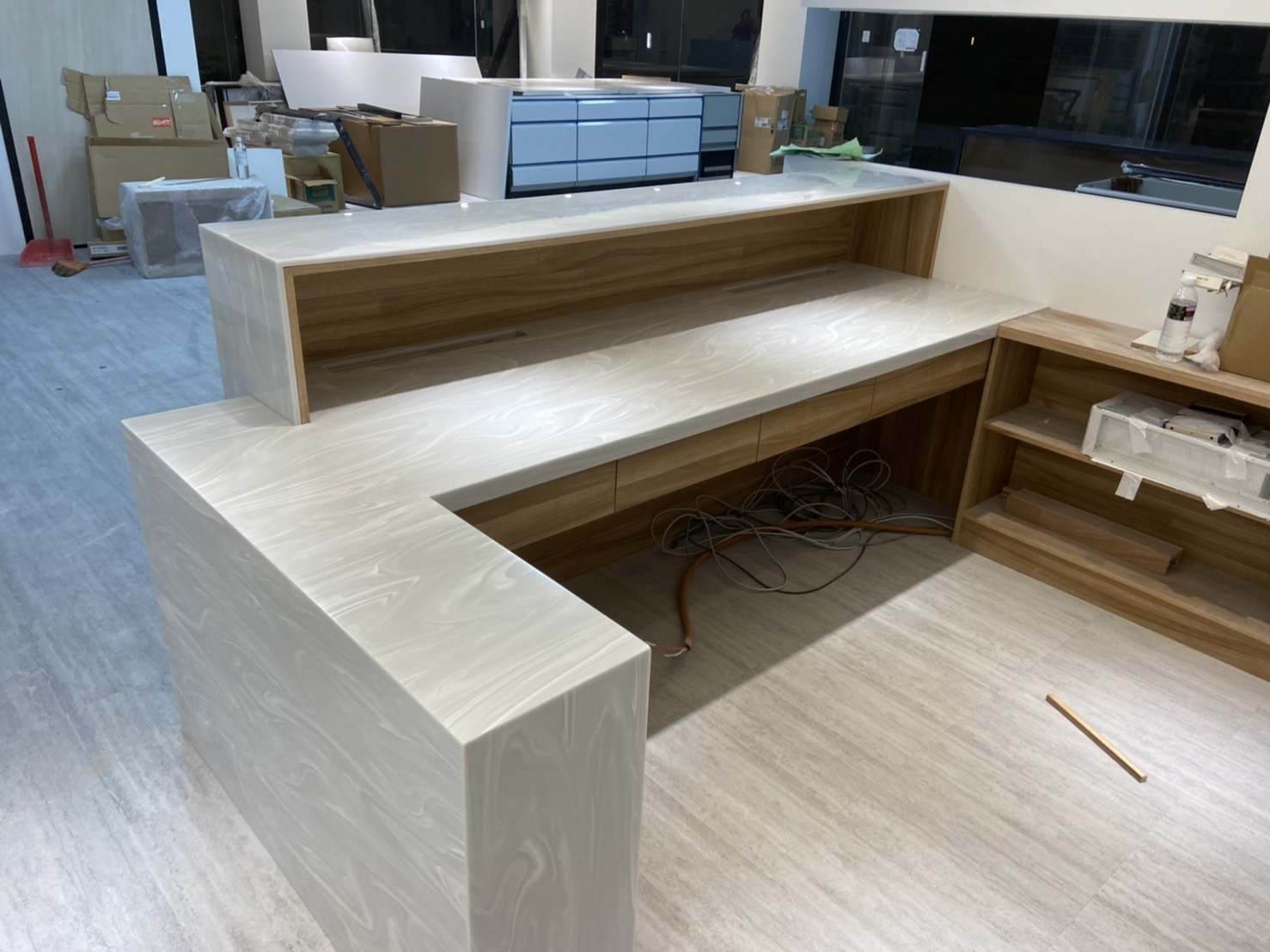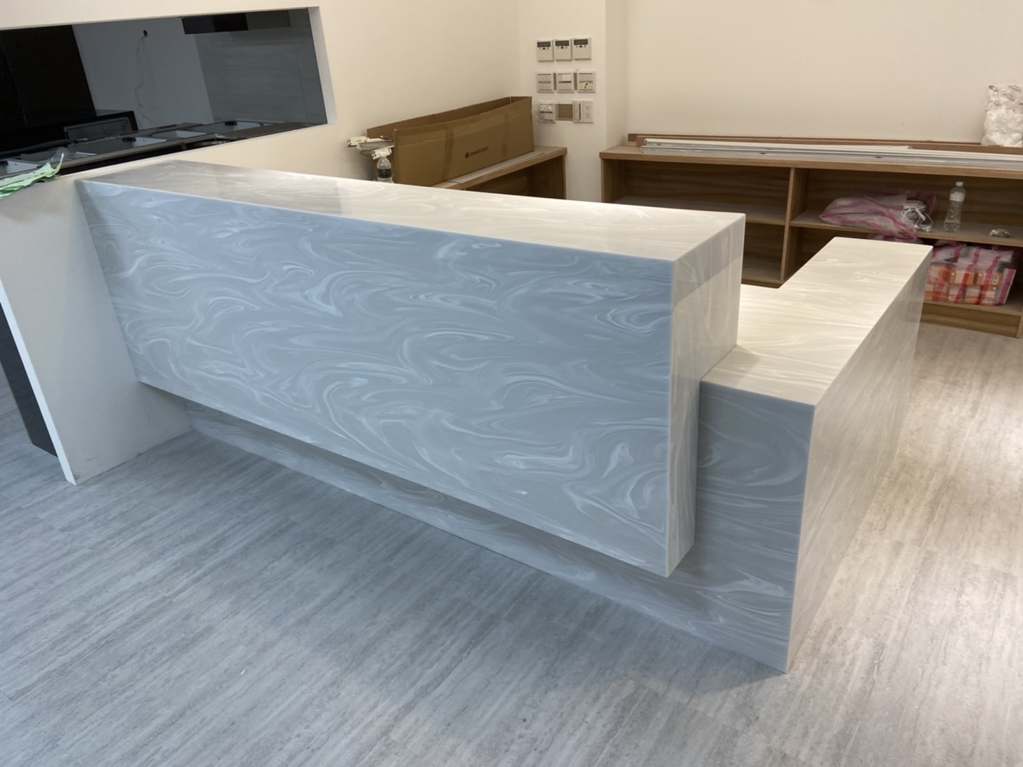 淺灰色營造出典雅、大氣的氛圍,同時也為空間帶來一種現代感。白色大波紋的設計為檯面注入了一絲活力和生氣,使得整個空間更加精緻和有品味。