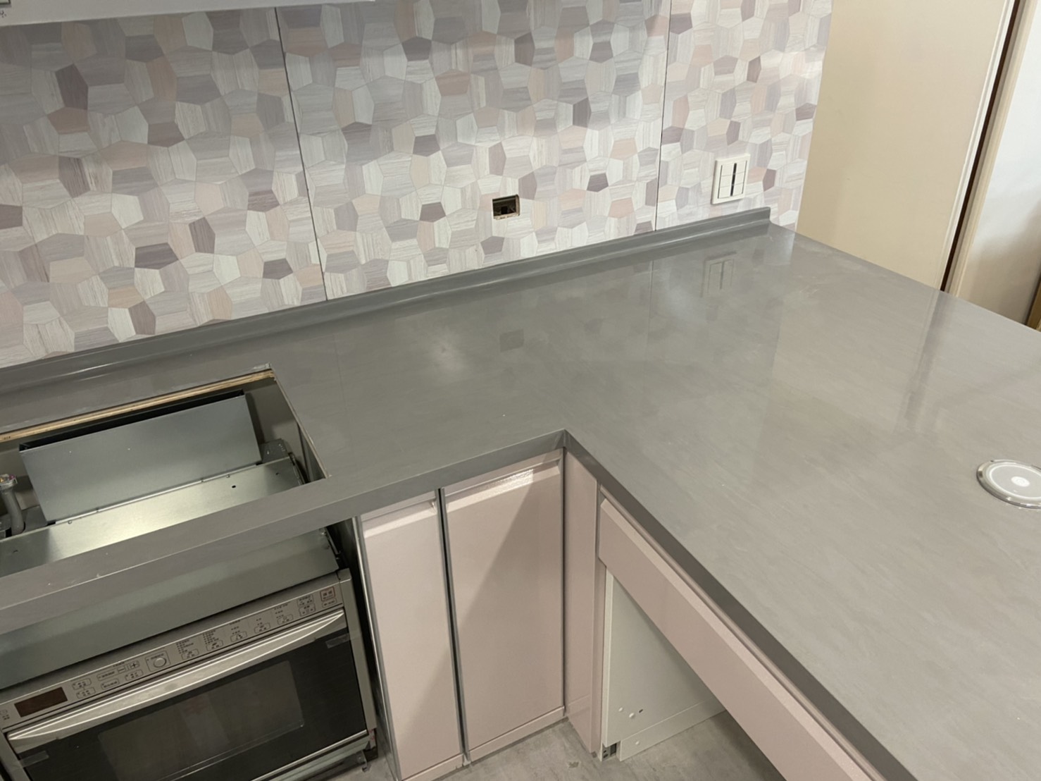 灰色人造石檯面搭配淺粉色櫥櫃是一種非常時尚且吸引人的設計方案