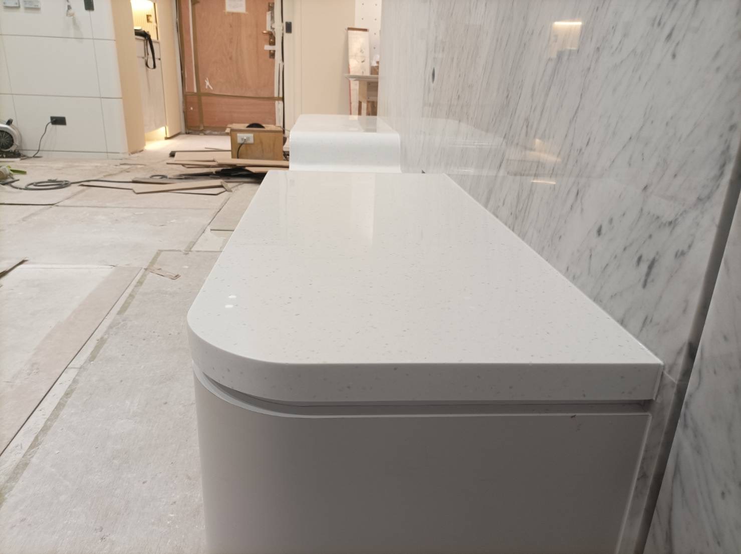 此色系人造石檯面以其明亮清潔的外觀以及自然生動的紋理特色,為室內空間增添了時尚感與美感,同時也帶來了舒適開放的空間氛圍。是設計中的理想選擇之一